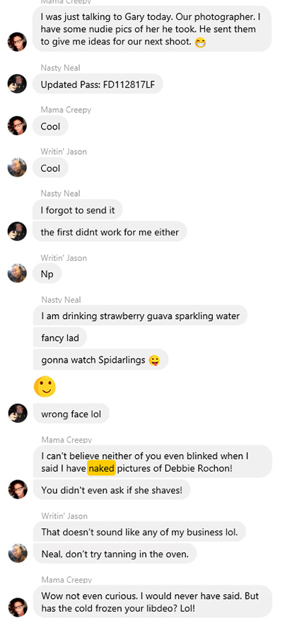 Heather claims Neal took the sexual harassment texts as jokes. Various screen shots in both private messages, group chats and public posts of Neal and Heather's running joke of sexually harassing each other. Also many audio examples I will add later.